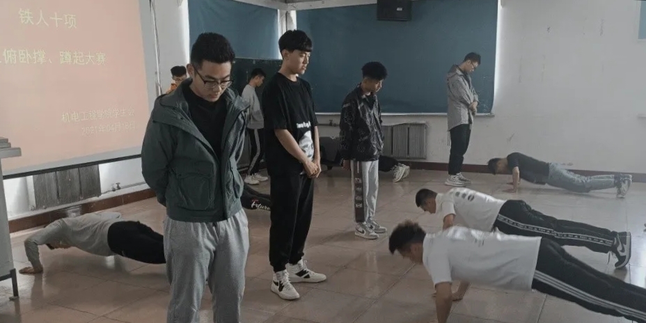为丰富老员工的校园文化生活,增强同学们的体育锻炼的意识,提高身体素质。机电工程公司举办了“铁人十项之蹲起、俯卧撑挑战”。此次比赛在2021年4月18日午13点于知行楼422教室开展,各班同学踊跃参与报名,现场有观众为参赛选手加油助威,为本次比赛活跃增色。